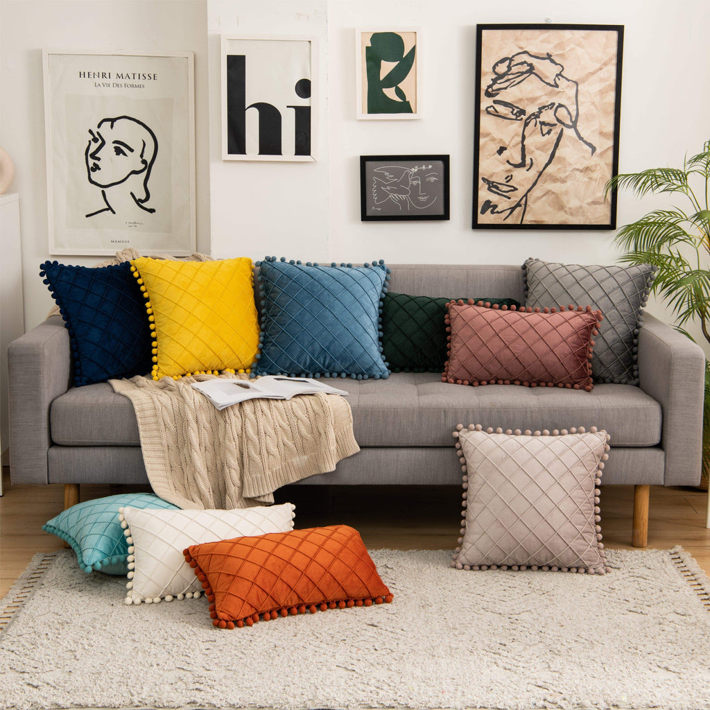 Maintaining the pristine look of your velvet cushions is simple. We designed this cover to be machine washable, so you don't need to worry about accidental spills or dust accumulation. Turn the cover inside out to protect the pom-poms, wash on a gentle cycle, and it comes out looking fresh and vibrant. Available in a wide array of modern colours, from soft pastels to bold jewel tones, you can easily mix and match them to create a layered, designer look that reflects your personal style.